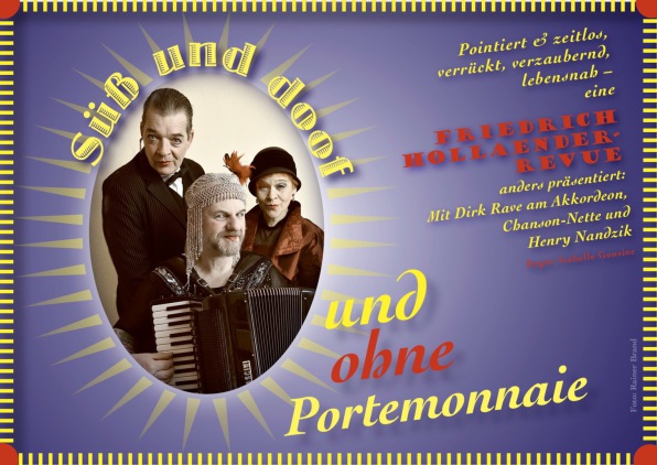 Dirk Rave, Chanson-Nette und Henry Nandzik entführen ihr Publikum auf schräge Weise in Hollaenders Welt, mit neuen Arrangements und mehrstimmigen Interpretationen im Stil der Comedian Harmonists.