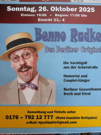 „Da kann man Waden seh´n, rund und schön im Wasser steh´n!“ singt Benno Radke. Und nicht nur das. Sein Repertoire ist schier unerschöpflich. Der Schlager- und Coupletsänger, Schauspieler und Humorist kann die Zeit um 1900 wieder lebendig werden lassen. Als Solist oder im Duett mit seiner Partnerin Sängerin Dörte Siebecke singt und spielt er die Lieder der damaligen Zeit im historischen Kostüm und mit gepflegtem „Kaiser-Wilhelm-Bart“.